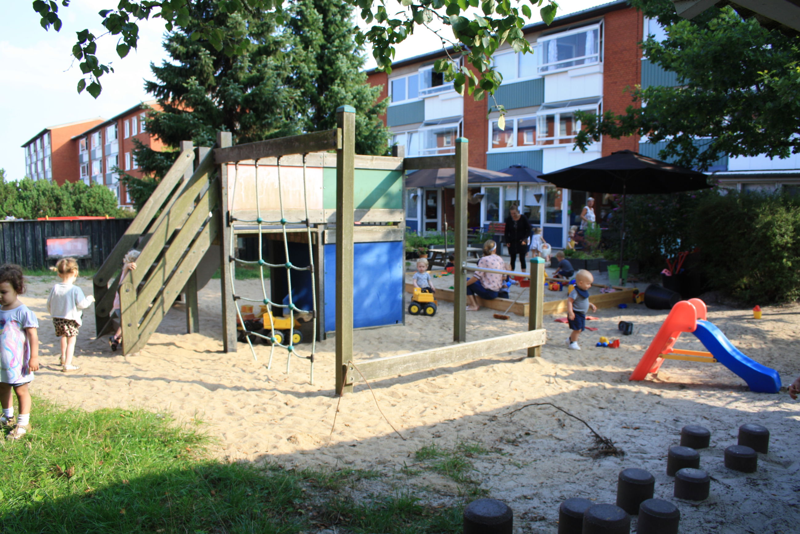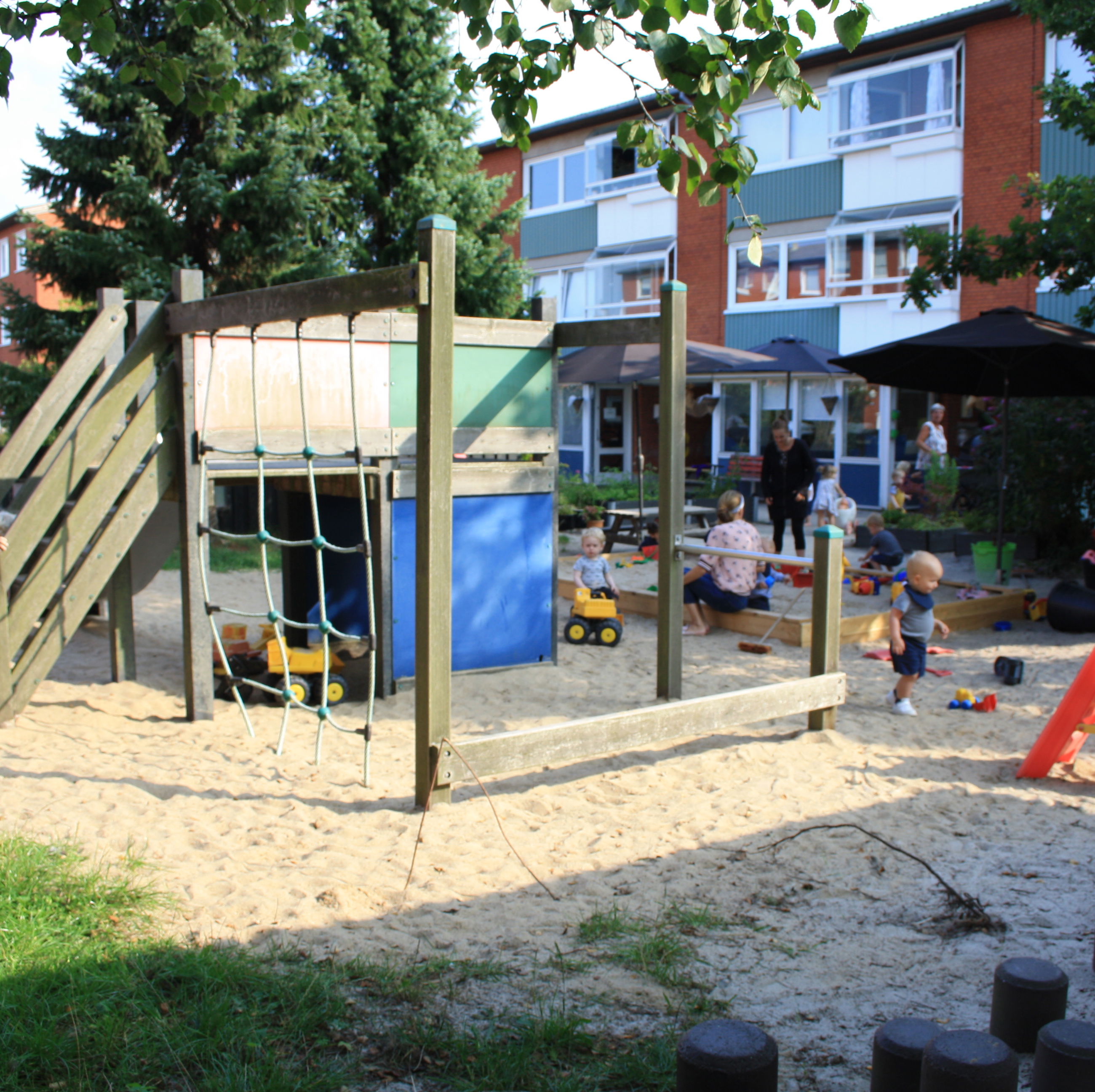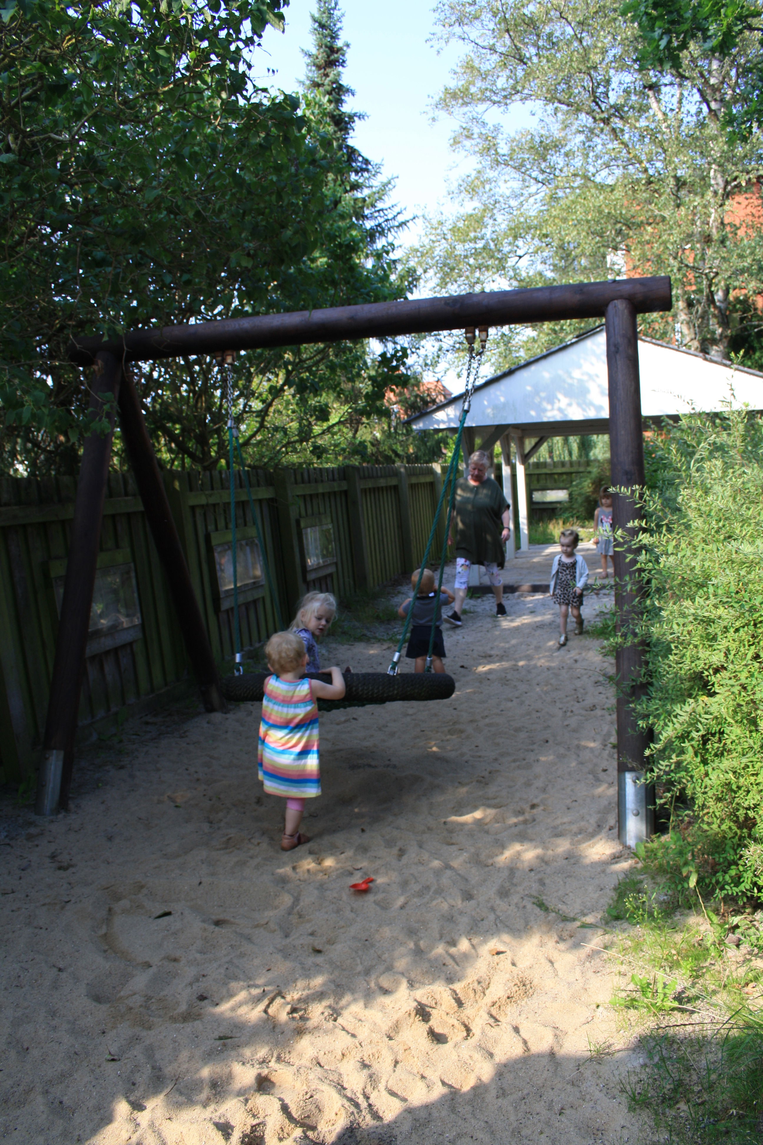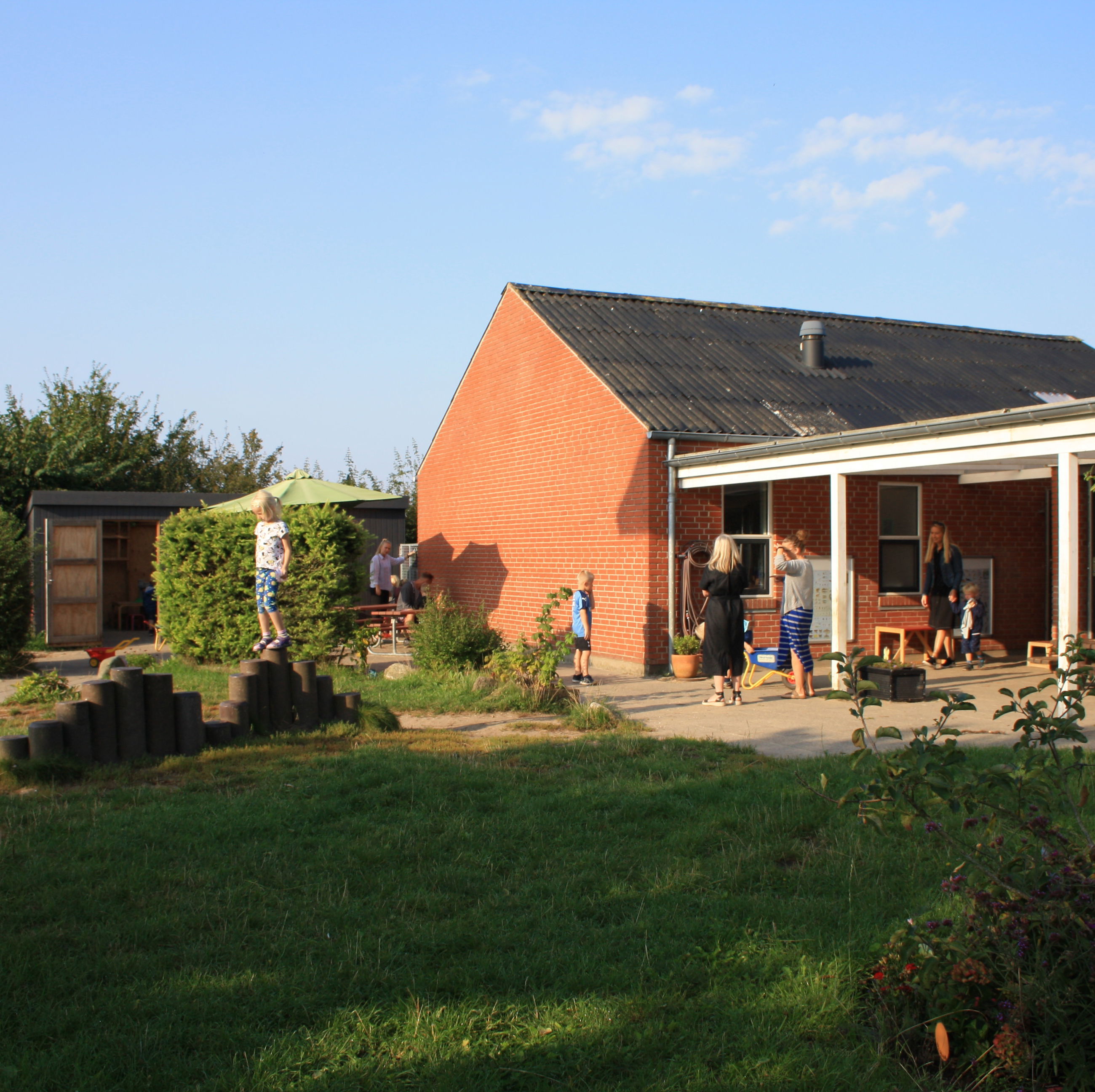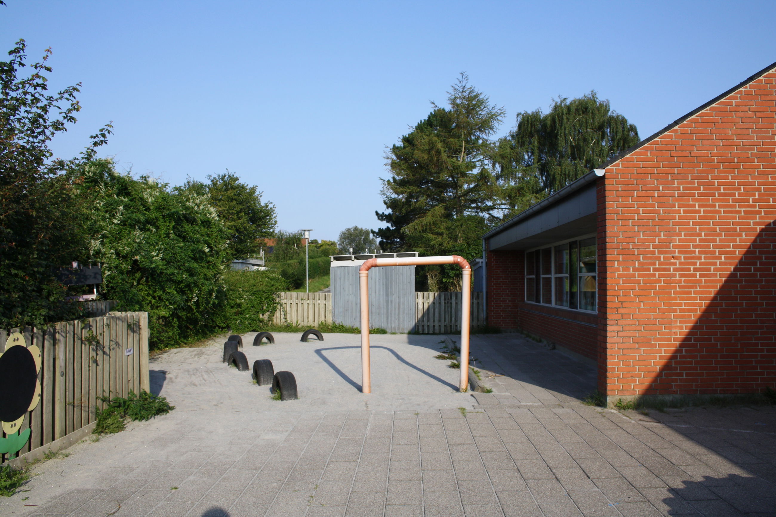 Vi har en skøn kuperet legeplads. Der er et halvtag ved udgangen til legepladsen, som gør, at vi kan trække flere aktiviteter udenfor og spise udenfor.