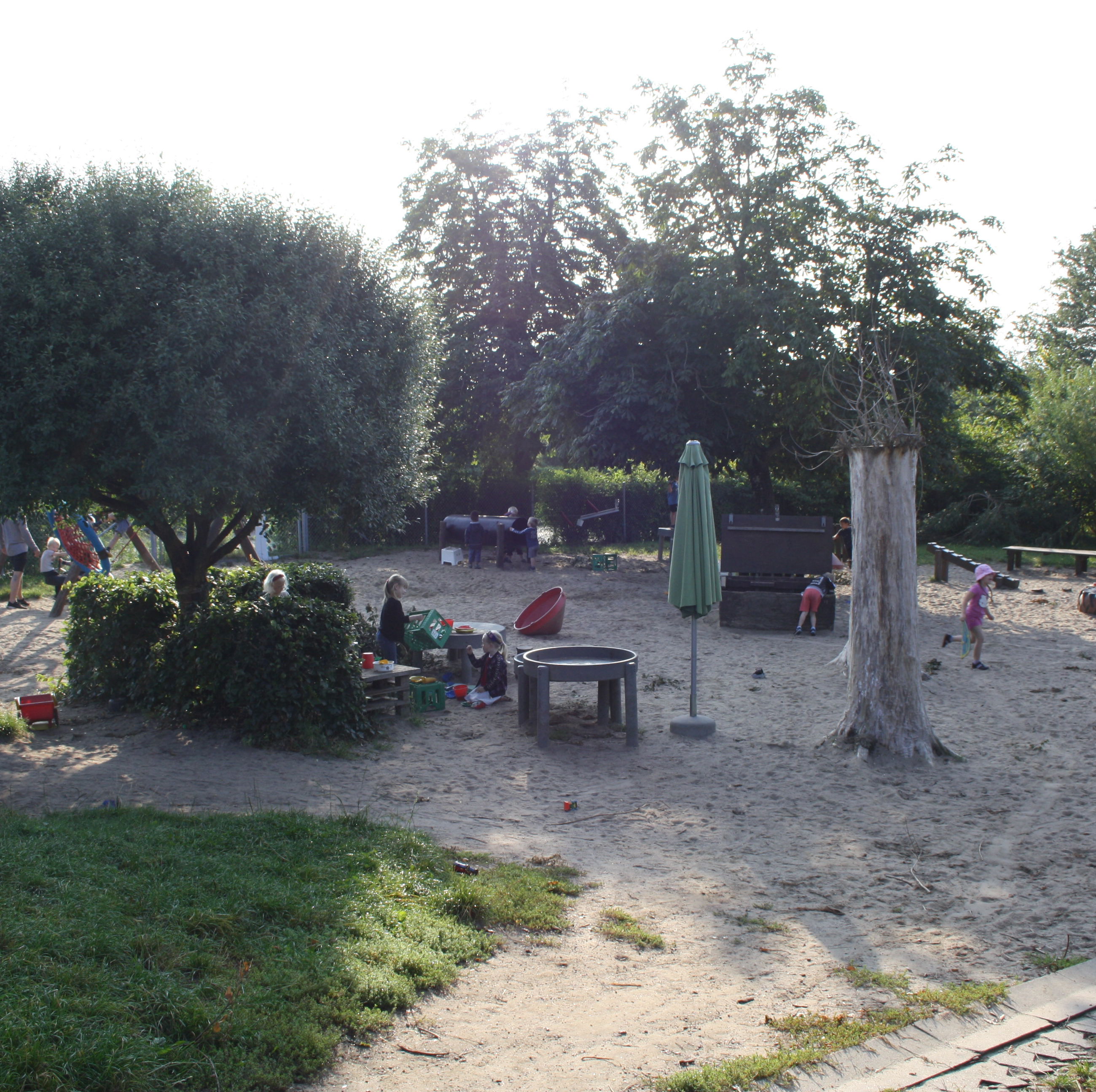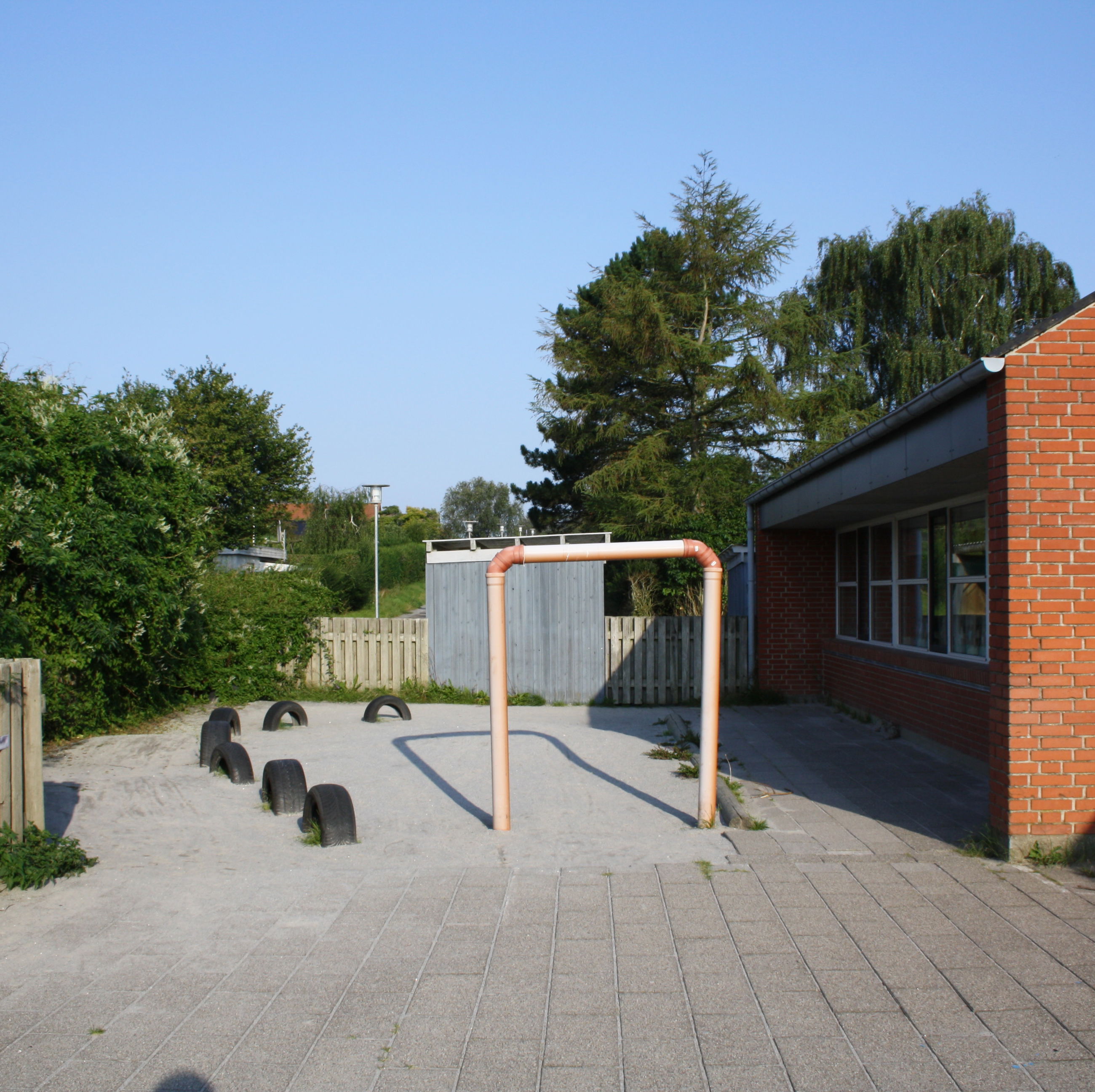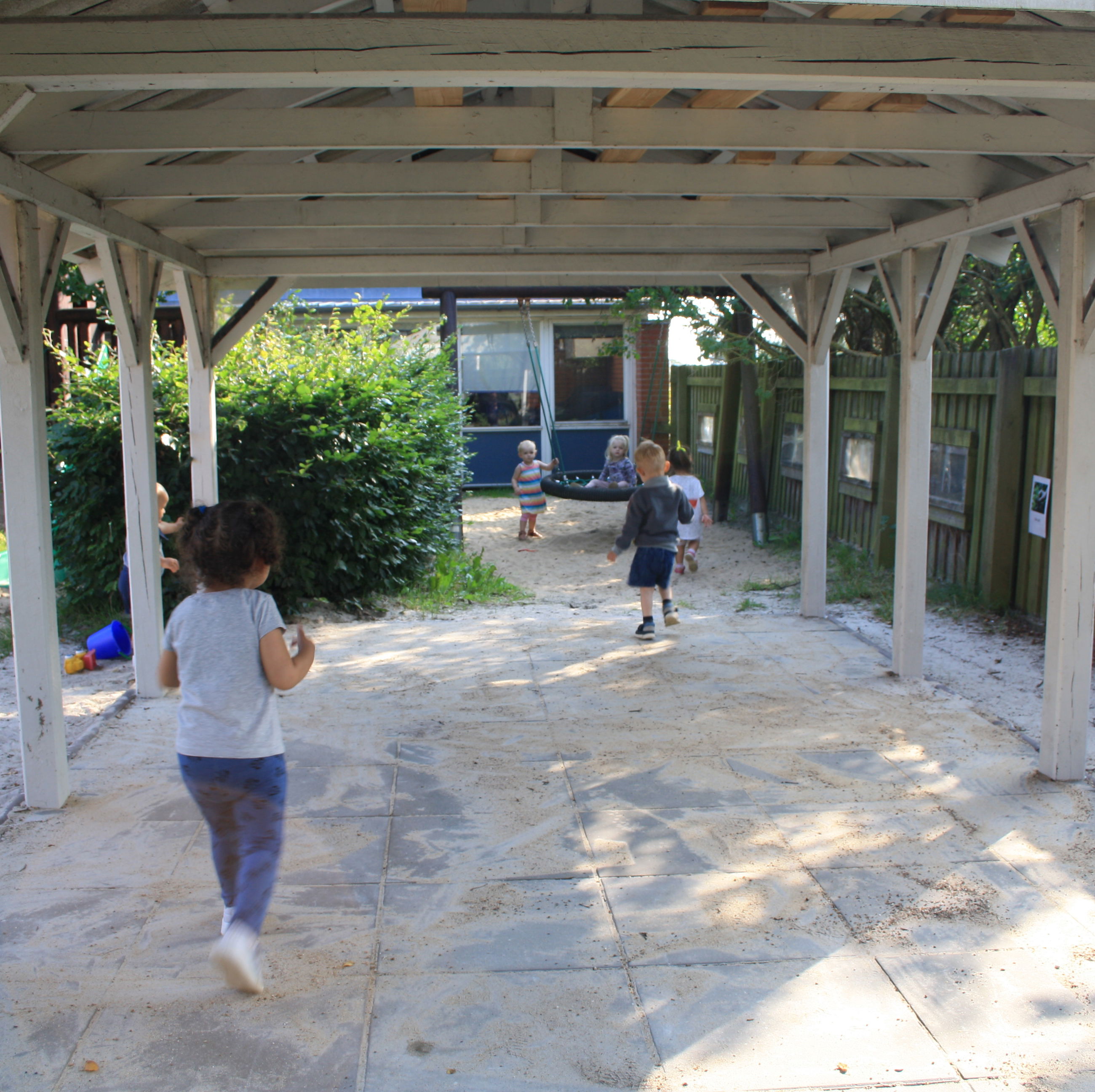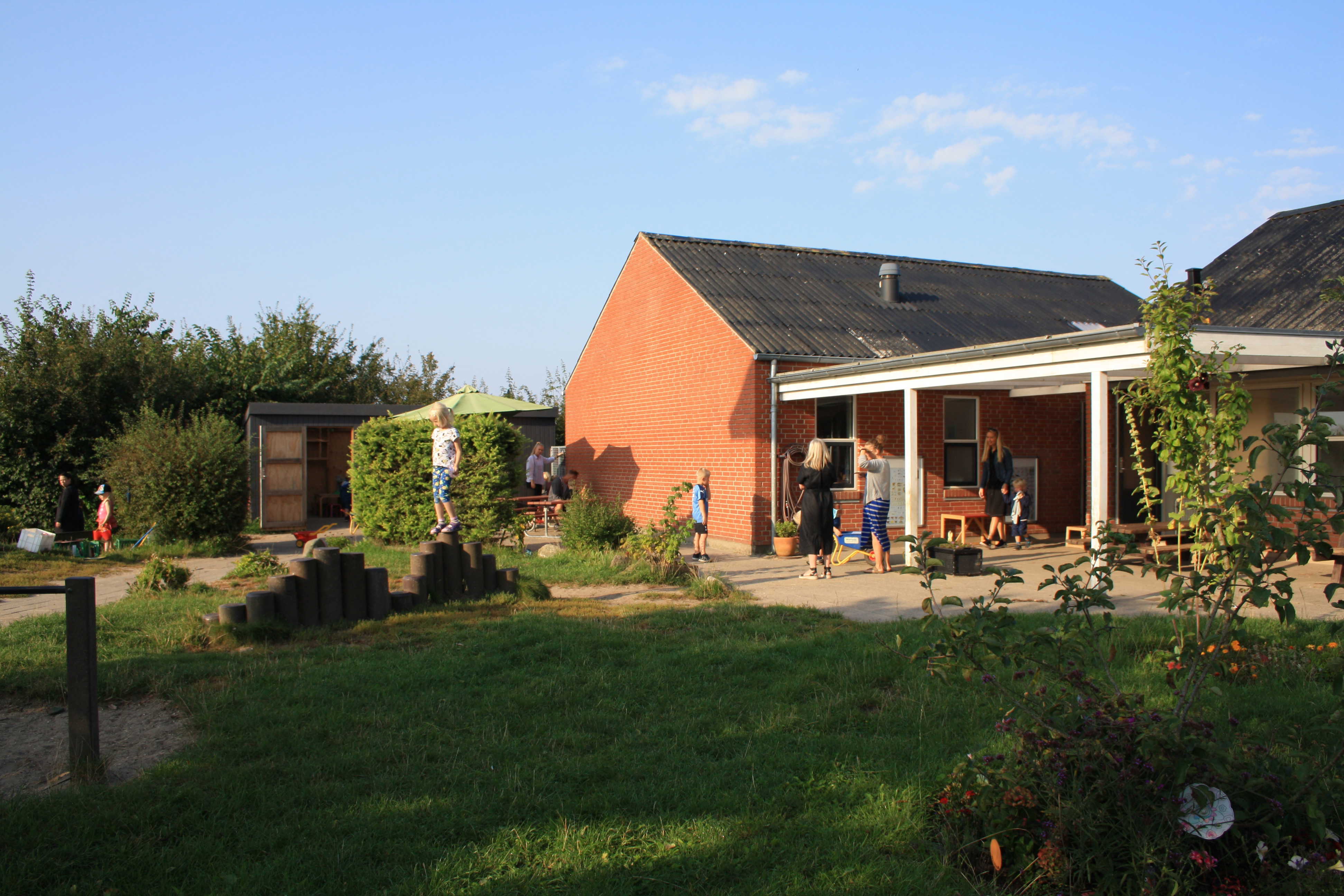 Vi har en skøn kuperet legeplads. Der er et halvtag ved udgangen til legepladsen, som gør, at vi kan trække flere aktiviteter udenfor og spise udenfor.