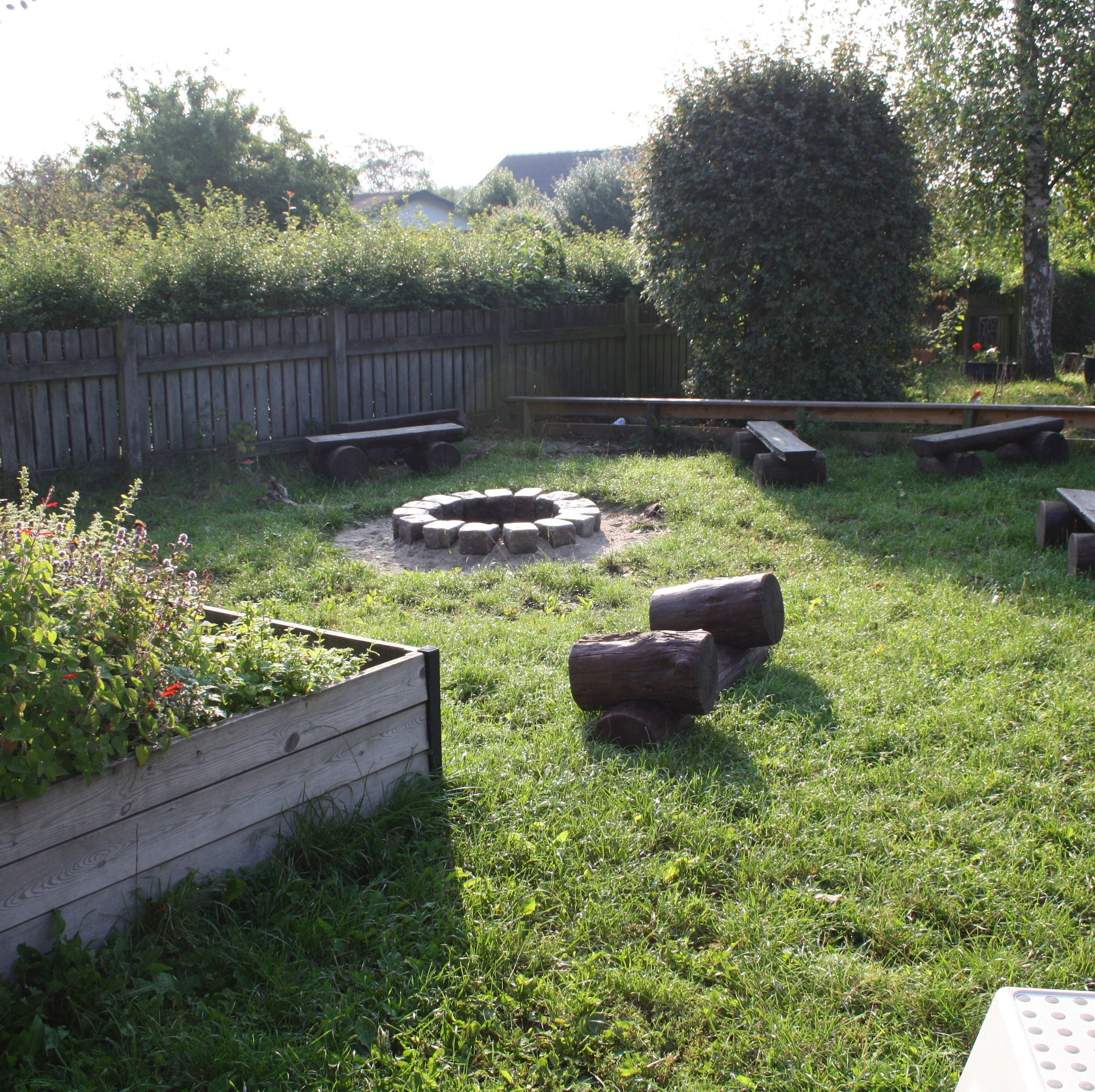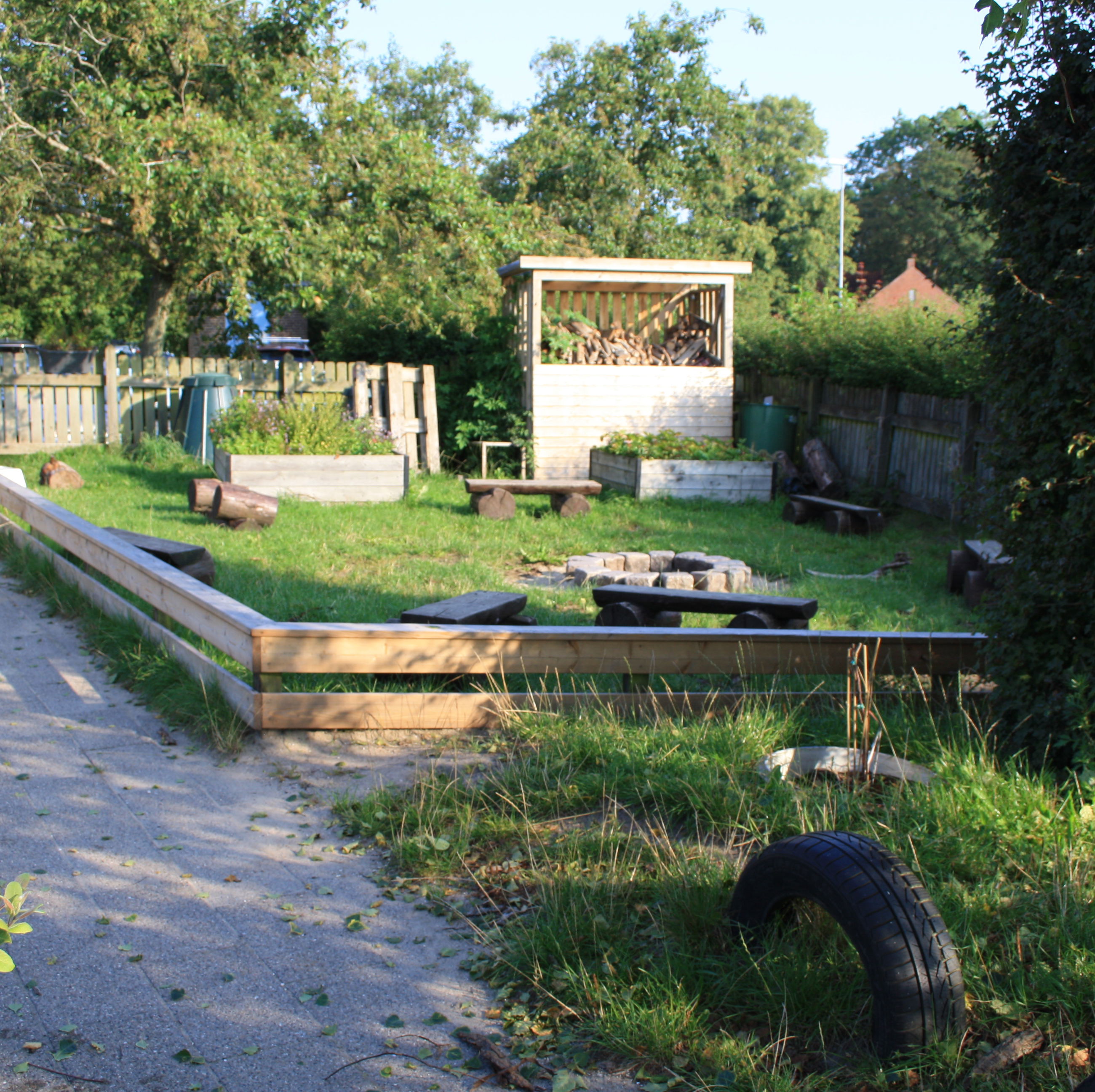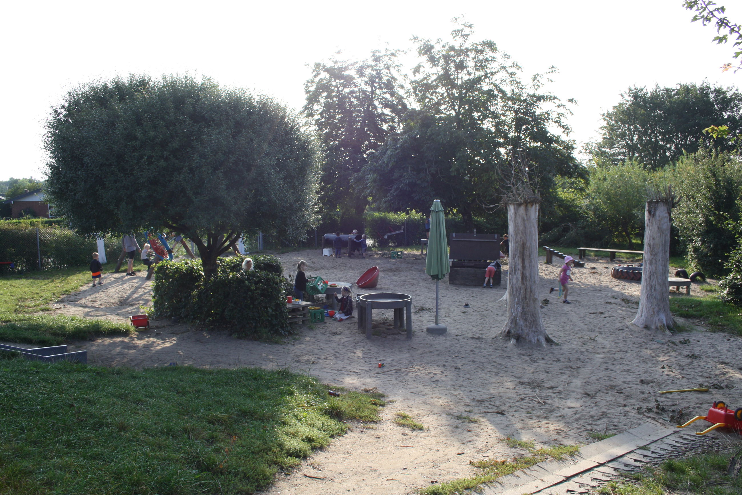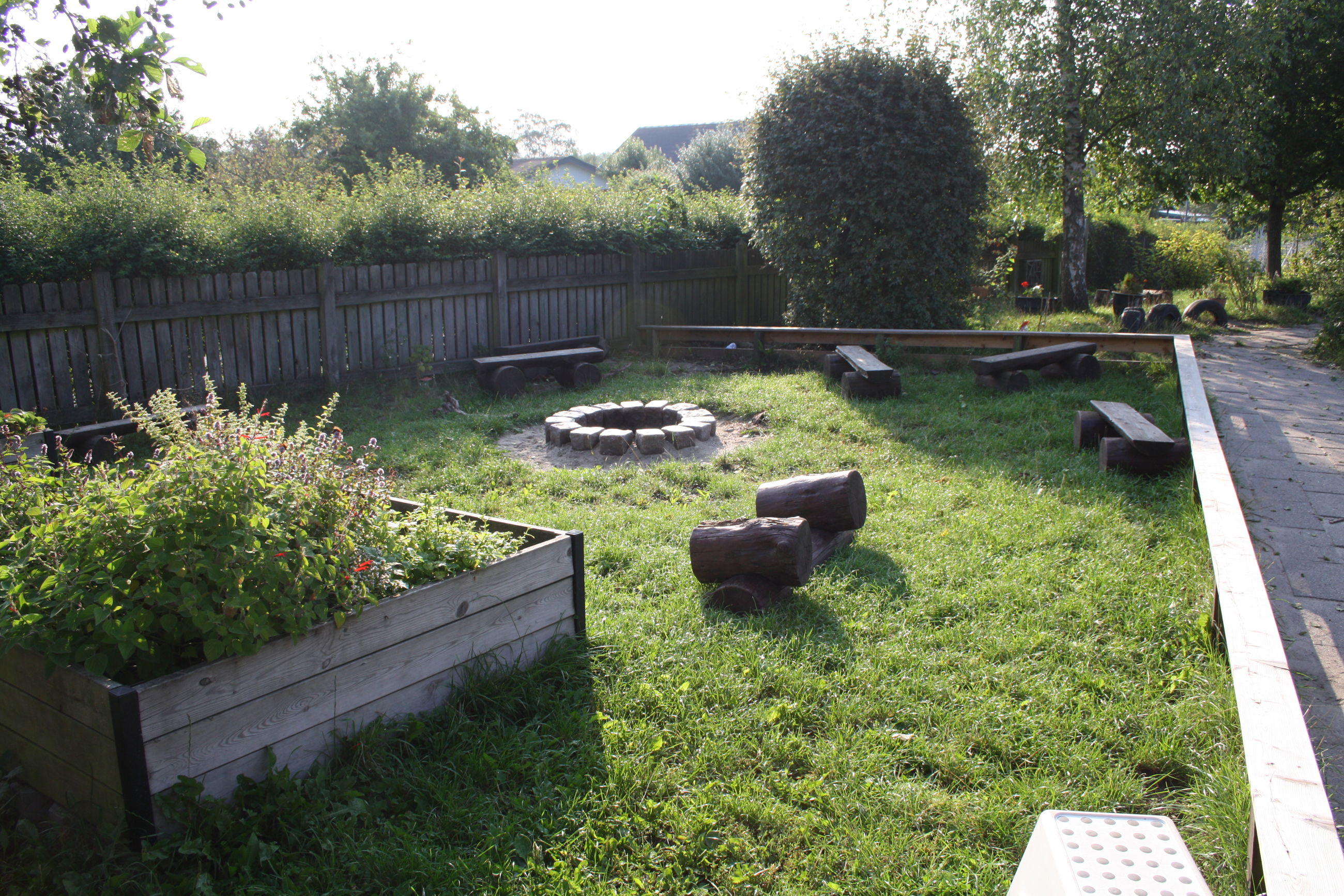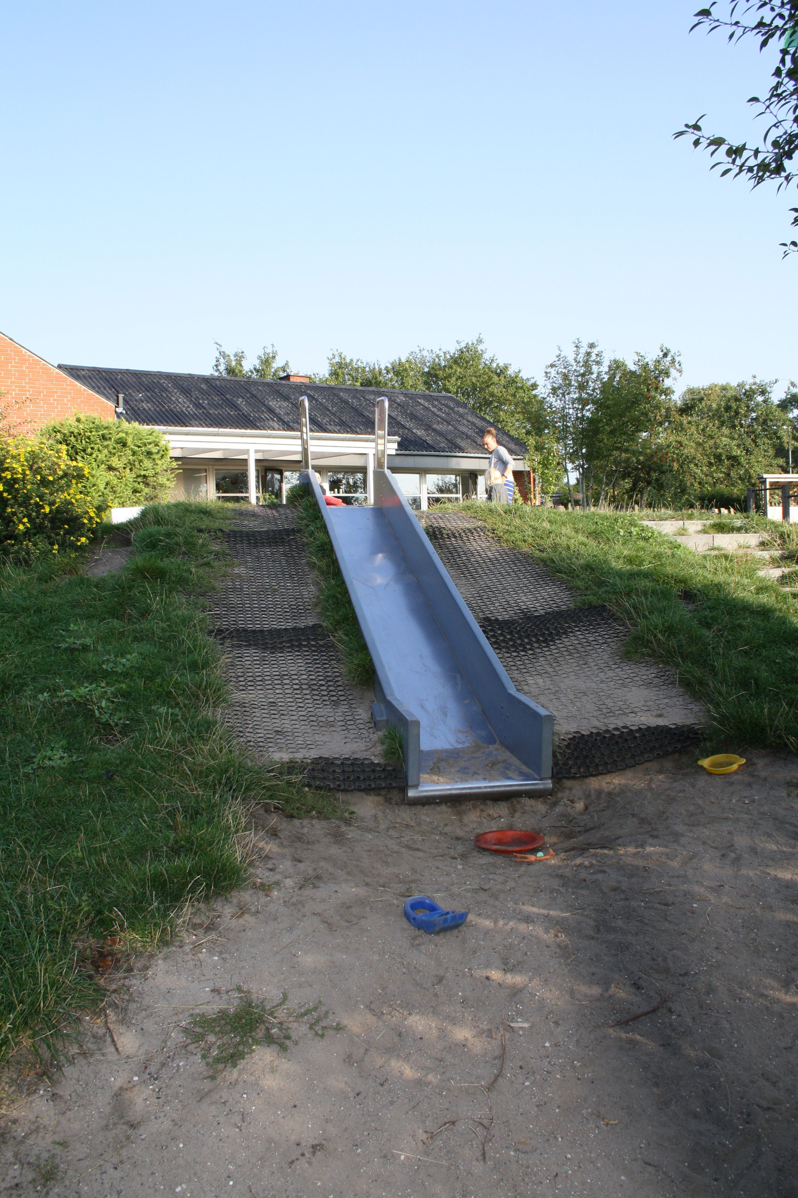 Vi har en skøn kuperet legeplads. Der er et halvtag ved udgangen til legepladsen, som gør, at vi kan trække flere aktiviteter udenfor og spise udenfor.