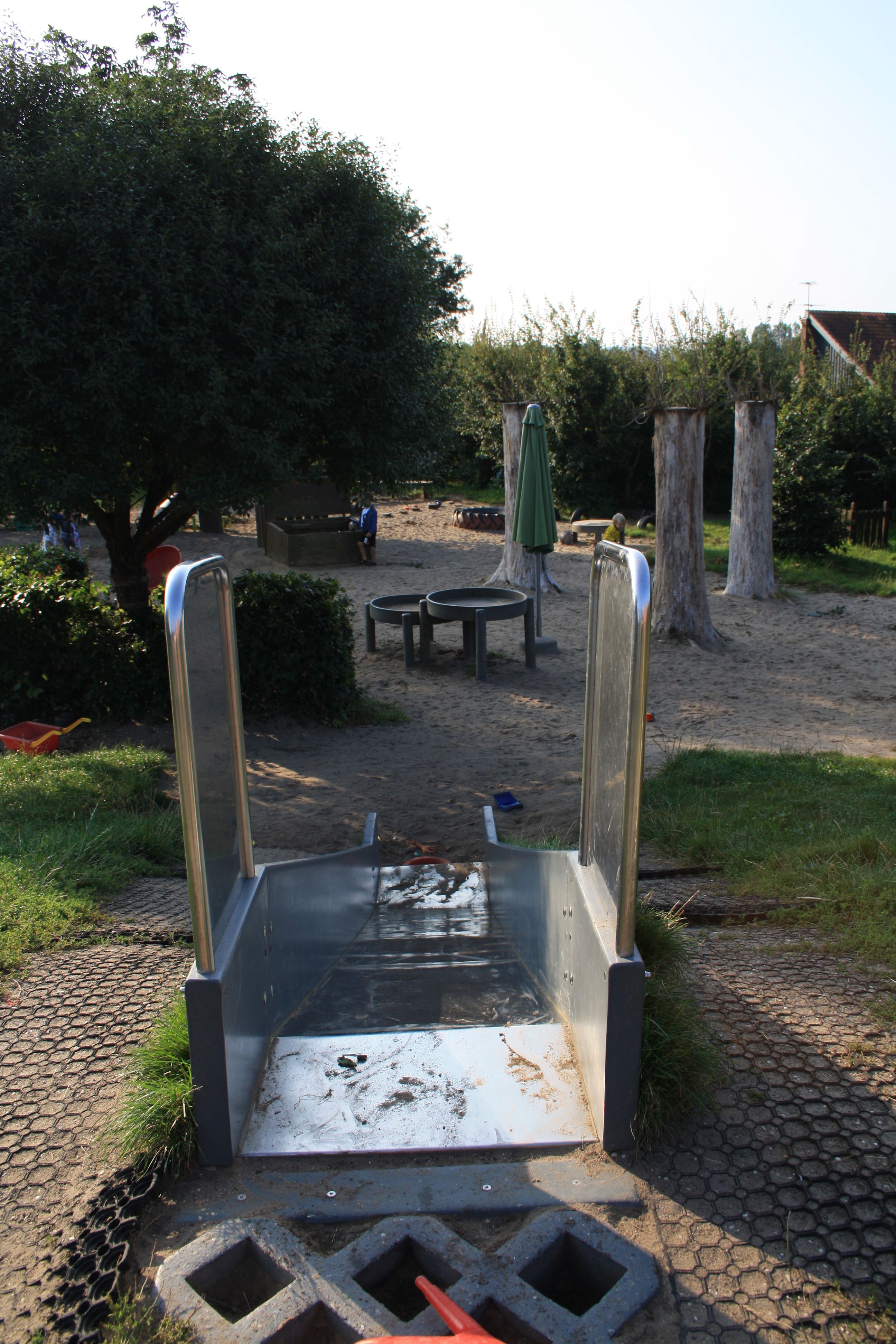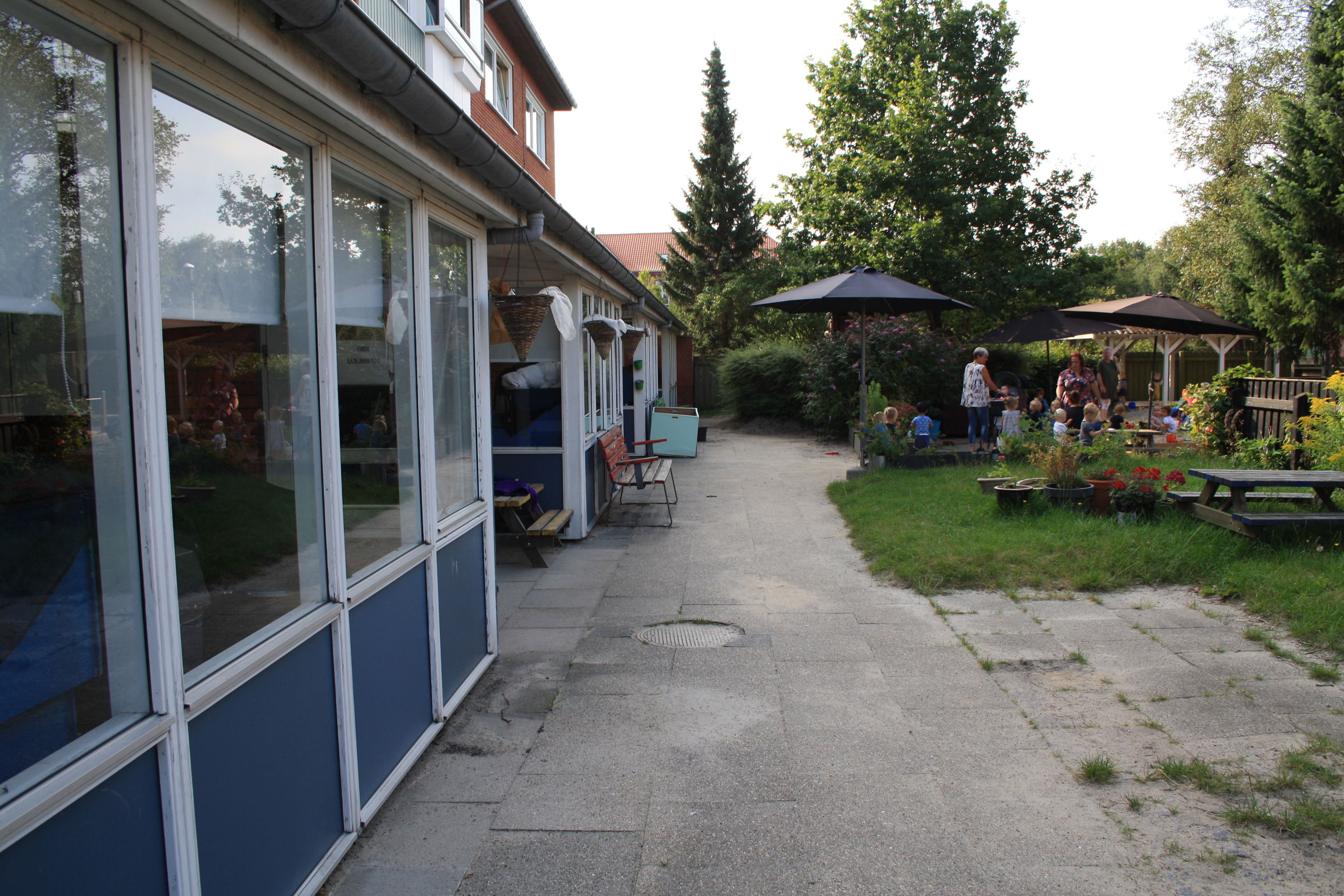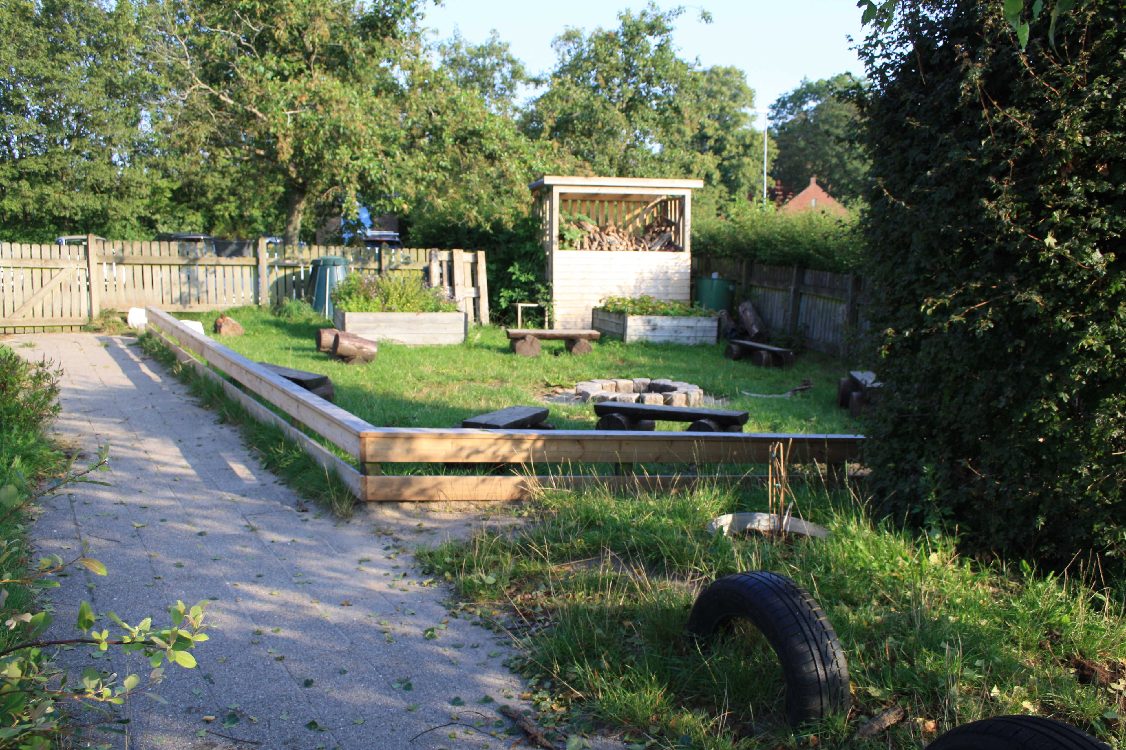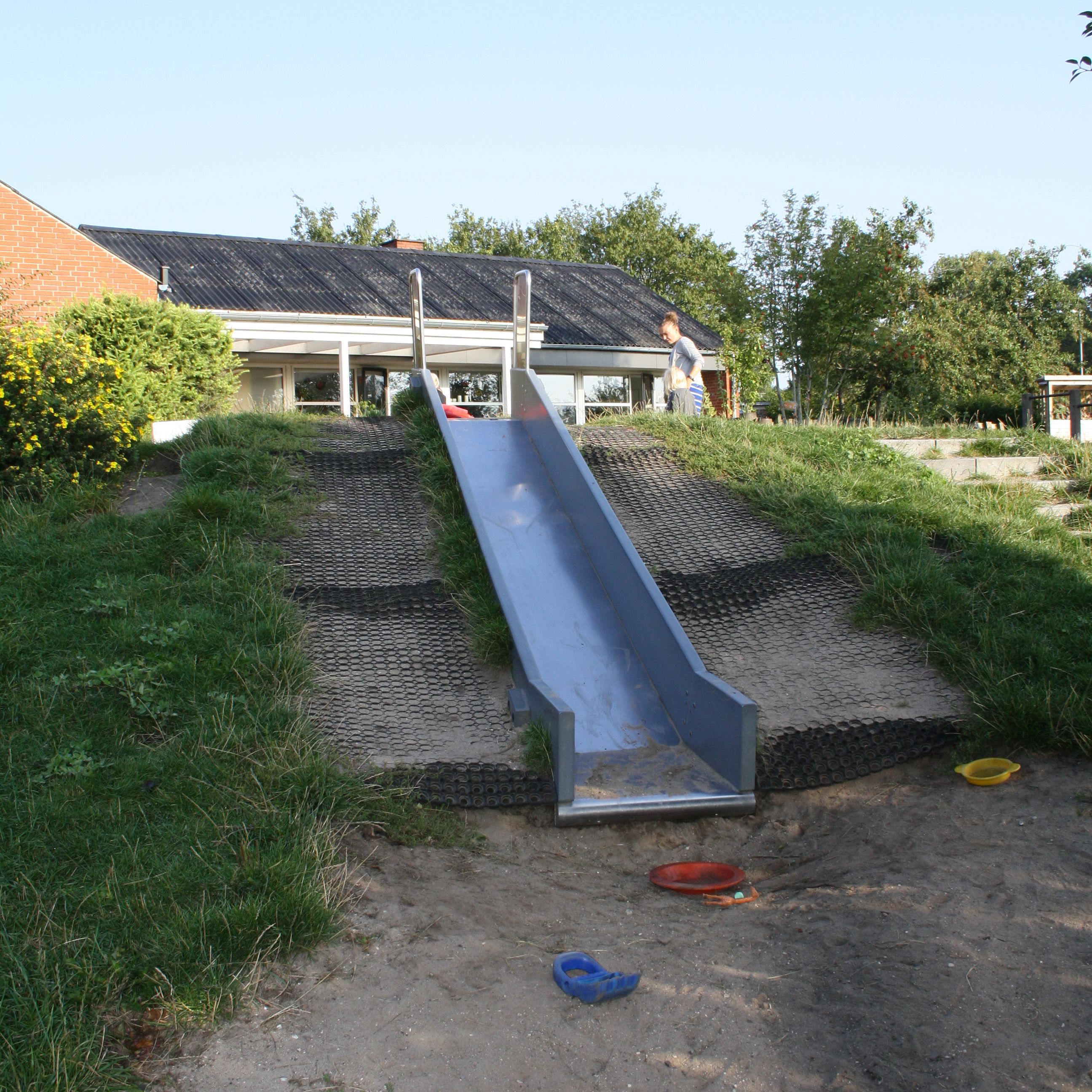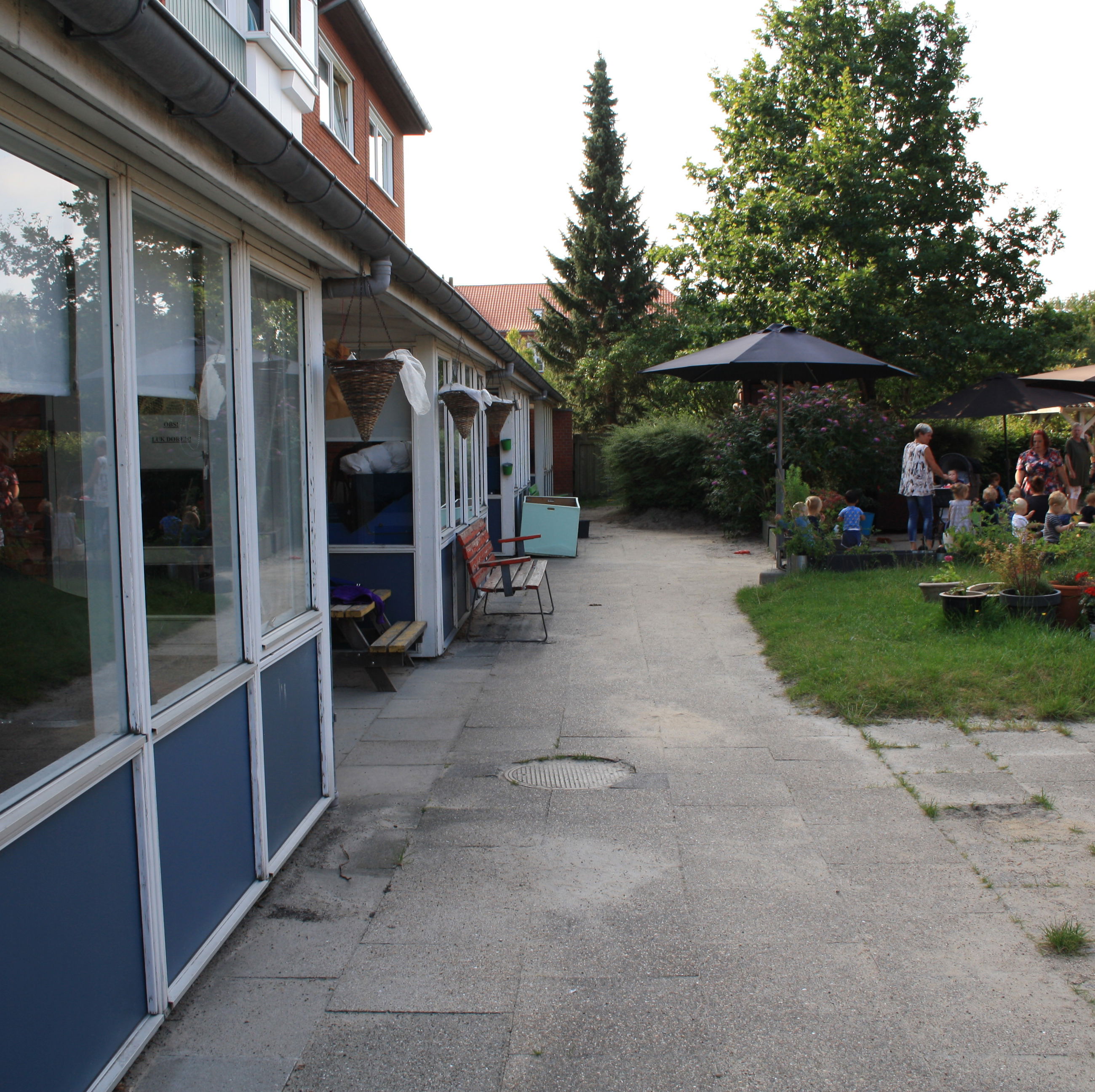 Vi har en skøn kuperet legeplads. Der er et halvtag ved udgangen til legepladsen, som gør, at vi kan trække flere aktiviteter udenfor og spise udenfor.