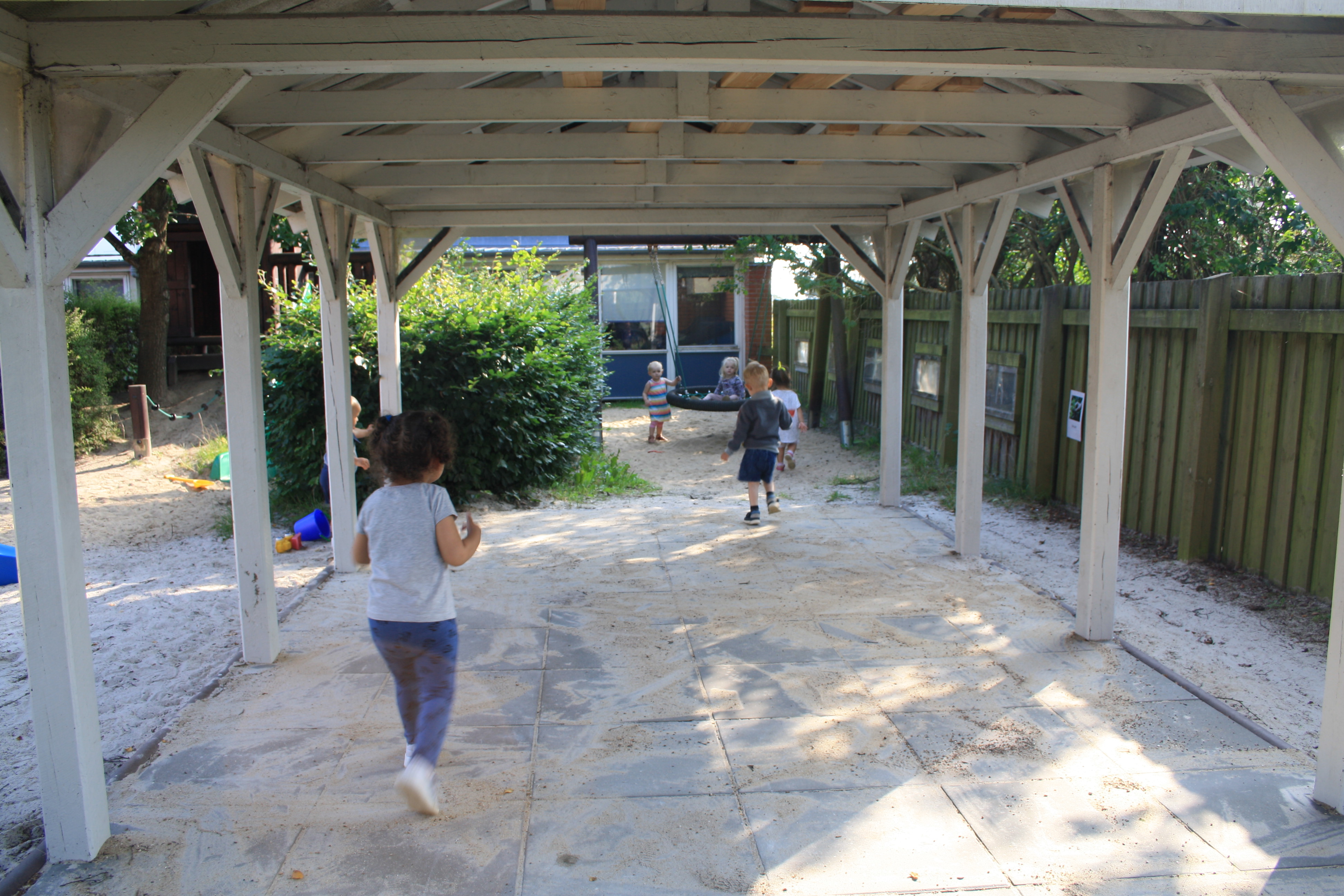 Vi har en skøn kuperet legeplads. Der er et halvtag ved udgangen til legepladsen, som gør, at vi kan trække flere aktiviteter udenfor og spise udenfor.